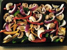 Web Zet in 4 stappen deze heerlijke Traybake met aubergine paprika en tomaat op tafel.